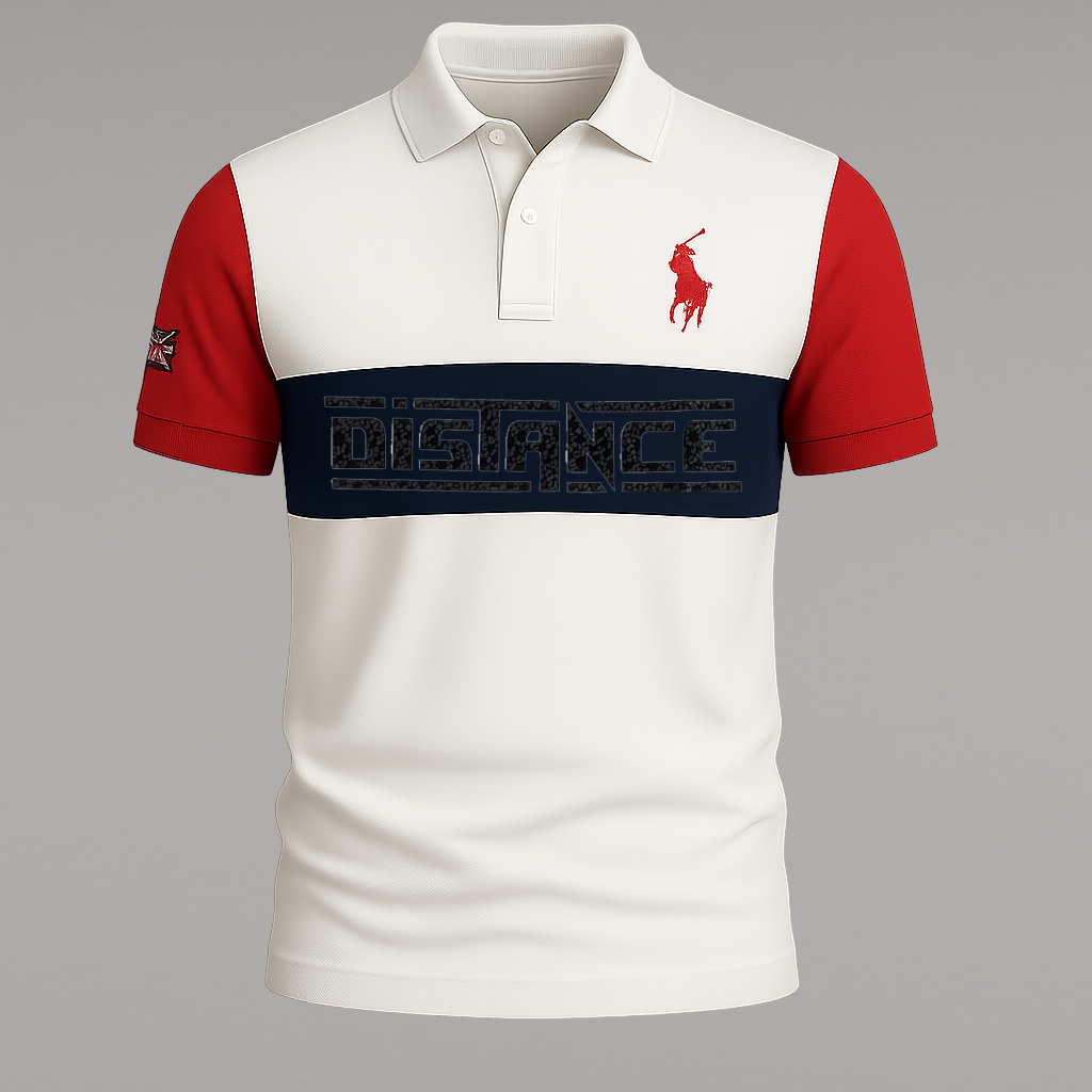 Add a modern twist to your wardrobe with this stylish Polo T-Shirt featuring a bold “DISTANCE” print on the front. Designed for men who want comfort with an edge.